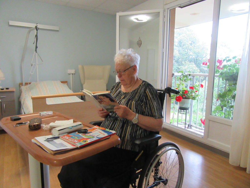 Vous disposez notamment d’un lit médicalisé, d’un fauteuil, d’un bureau, d’une table de chevet, d’un placard.